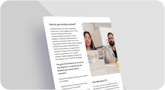 S o , w h y a r e u n i c o r n s l o c a l i s i n g ? I t ’s b e c a u s e t h e b e s t - p e r f o r m i n g c o m p a n i e s t o d a y a l l h a v e o n e t h i n g i n c o m m o n : t h e y p u t t h e i r c u s t o m e r ’s e x p e r i e n c e f i r s t . C o m p a n i e s t h a t t r e a t c o n t e n t l o c a l i s a t i o n a s a p r i o r i t y s h o w t h a t t h e y c a r e a b o u t h o w t h e i r c u s t o m e r s f e e l . R e m e m b e r t h a t n e a r l y h a l f o f E u r o p e a n c o n s u m e r s f e e l l e f t o u t i f c o n t e n t i s n o t a v a i l a b l e i n t h e i r l a n g u a g e . A c u s t o m e r - f o c u s e d c o m p a n y n e v e r w a n t s p o t e n t i a l c u s t o m e r s t o f e e l l e f t o u t . W h e n w e s p o k e t o u n i c o r n s a b o u t t h e i r l o c a l i s a t i o n g o a l s , i m p r o v i n g e n g a g e m e n t w i t h l o c a l a u d i e n c e s w a s o n e o f t h e i r t o p c o n c e r n s . We l e a r n e d t h a t l o c a l i s a t i o n i s a b o u t m o r e t h a n j u s t e n s u r i n g y o u r c u s t o m e r c a n u n d e r s t a n d y o u r m e s s a g e . I t ’s a b o u t g i v i n g t h e m a n o p t i m a l , h i g h - q u a l i t y e x p e r i e n c e a t e v e r y s t a g e o f t h e c u s t o m e r j o u r n e y . L o c a l i s e d c o n t e n t i s n’t a b o u t t r a n s l a t i n g c o n t e n t i n t o a n e w l a n g u a g e w o r d f o r w o r d . I t ’s a b o u t f i n d i n g t h e b e s t w a y t o c o m m u n i c a t e y o u r m e s s a g e t o a n o t h e r a u d i e n c e . A l o c a l i s a t i o n p r o f e s s i o n a l i s a t r a n s l a t o r a n d c o n t e n t c r e a t o r a l l a t o n c e . T h e y a d a p t c o n t e n t i n t o t h e i r n a t i v e l a n g u a g e , a n d t h e y h a v e a d e e p u n f d e r s t a n d i n g o f c u l t u r a l n o r m s a n d h o w t o m a k e t h e b e s t i m p r e s s i o n . T h e y k n o w h o w t o a d a p t y o u r c o n t e n t s o y o u w i n d u p w i t h a s t y l i s h , a u t h e n t i c , h i g h l y e n g a g i n g n e w a s s e t t h a t j u s t h a p p e n s t o b e i n a d i f f e r e n t l a n g u a g e . D u r i n g t h e l o c a l i s a t i o n p r o c e s s , y o u r l o c a l i s e r w i l l p r o b a b l y : I n t h e e n d , t h e r e a d e r w i l l f e e l c o m p l e t e l y i n c l u d e d i n t h e t e x t . T h e g o a l i s t o e l i m i n a t e a n y l i n g u i s t i c o r c u l t u r a l b a r r i e r s b e t w e e n y o u r b r a n d a n d i t s c u s t o m e r s . How do you localise content? Let’s talk about CX C o n t e n t L o c a l i s a t i o n P a g e 4 A d j u s t t h e l e v e l o f f o r m a l i t y t o m a t c h t h e i r c u l t u r e ’s n o r m s o r t h e c o n t e x t . R e m o v e c u l t u r a l r e f e r e n c e s f r o m t h e o r i g i n a l c o n t e n t t h a t w i l l n o t m a k e s e n s e t o t h e n e w a u d i e n c e ; r e p l a c i n g t h e m w i t h c u l t u r a l r e f e r e n c e s t h a t r e s o n a t e w i t h t h e n e w a u d i e n c e . C h a n g e t h e s t r u c t u r e o f t h e c o n t e n t t o e n s u r e i t ’s i n l i n e w i t h t h e t a r g e t a u d i e n c e ’s c u l t u r a l n o r m s a n d r e a d i n g p r e f e r e n c e s . C h o o s e a u t h e n t i c k e y w o r d s t o l o c a l i s e t h e c o n t e n t ’s S E O. A d j u s t t h e e m o t i o n a l i t y o r t e c h n i c a l i t y o f t h e c o n t e n t t o c a t e r t o t h e t a r g e t a u d i e n c e ’s c u l t u r a l p r e f e r e n c e s . T h e g o a l of l o c a l i s a t i o n i s t o re m ove a n y l i n g u i st i c o r c u l t u ra l b a r r i e rs b et we e n y o u r b ra n d a n d i t s c u st o m e rs.