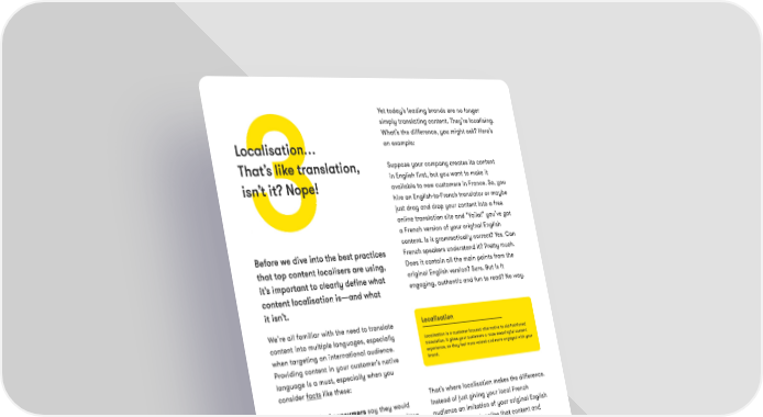 3 B e fo re we d i ve i n t o t h e b e st p ra c t i c e s t h a t t o p c o n te n t l o c a l i s e rs a re u s i n g , i t ’s i m p o r t a n t t o c l e a r l y d e f i n e w h a t c o n te n t l o c a l i s a t i o n i s — a n d w h a t i t i s n’t . Ye t t o d a y ’s l e a d i n g b r a n d s a r e n o l o n g e r s i m p l y t r a n s l a t i n g c o n t e n t . T h e y ’ r e l o c a l i s i n g . W h a t ’s t h e d i f f e r e n c e , y o u m i g h t a s k ? H e r e ’s a n e x a m p l e : S u p p o s e y o u r c o m p a n y c r e a t e s i t s c o n t e n t i n E n g l i s h f i r s t , b u t y o u w a n t t o m a k e i t a v a i l a b l e t o n e w c u s t o m e r s i n F r a n c e . S o , y o u h i r e a n E n g l i s h - t o - F r e n c h t r a n s l a t o r o r m a y b e j u s t d r a g a n d d r o p y o u r c o n t e n t i n t o a f r e e o n l i n e t r a n s l a t i o n s i t e a n d “ Vo i l a ! ” y o u ’ v e g o t a F r e n c h v e r s i o n o f y o u r o r i g i n a l E n g l i s h c o n t e n t . I s i t g r a m m a t i c a l l y c o r r e c t ? Ye s . C a n F r e n c h s p e a k e r s u n d e r s t a n d i t ? P r e t t y m u c h . D o e s i t c o n t a i n a l l t h e m a i n p o i n t s f r o m t h e o r i g i n a l E n g l i s h v e r s i o n ? S u r e . B u t i s i t e n g a g i n g , a u t h e n t i c a n d f u n t o r e a d ? N o w a y . T h a t ’s w h e r e l o c a l i s a t i o n m a k e s t h e d i f f e r e n c e . I n s t e a d o f j u s t g i v i n g y o u r l o c a l F r e n c h a u d i e n c e a n i m i t a t i o n o f y o u r o r i g i n a l E n g l i s h c o n t e n t , y o u c a n l o c a l i s e t h a t c o n t e n t a n d g i v e y o u r F r e n c h a u d i e n c e t h e f e e l i n g t h a t y o u w e r e s p e a k i n g d i r e c t l y t o t h e m a l l a l o n g . T h e r e a d e r s h o u l d n e v e r h a v e t h e f e e l i n g t h a t t h e y ’ r e r e a d i n g a t r a n s l a t i o n . We ’ r e a l l f a m i l i a r w i t h t h e n e e d t o t r a n s l a t e c o n t e n t i n t o m u l t i p l e l a n g u a g e s , e s p e c i a l l y w h e n t a r g e t i n g a n i n t e r n a t i o n a l a u d i e n c e . P r o v i d i n g c o n t e n t i n y o u r c u s t o m e r ’s n a t i v e l a n g u a g e i s a m u s t , e s p e c i a l l y w h e n y o u c o n s i d e r f a c t s l i k e t h e s e : Localisation... That’s like translation, isn’t it? Nope! C o n t e n t L o c a l i s a t i o n P a g e 3 N e a r l y 4 0 % o f c o n s u m e r s s a y t h e y w o u l d n e v e r b u y f r o m a w e b s i t e t h a t i s n o t w r i t t e n i n t h e i r n a t i v e l a n g u a g e . O v e r 7 5 % o f i n t e r n e t u s e r s p r e f e r t o r e a d p r o d u c t i n f o r m a t i o n i n t h e i r n a t i v e l a n g u a g e . N e a r l y h a l f o f a l l E u r o p e a n i n t e r n e t u s e r s f e e l t h e y a r e m i s s i n g i m p o r t a n t i n f o r m a t i o n w h e n w e b p a g e s a r e n’t t r a n s l a t e d i n t o t h e i r l a n g u a g e . 7 5 % o f c o n s u m e r s s a y t h e y a r e m o r e l i k e l y t o b u y t h e s a m e b r a n d a g a i n i f t h e y r e c e i v e a f t e r s a l e s s u p p o r t i n t h e i r n a t i v e l a n g u a g e . L o c a l i s a t i o n L o c a l i s a t i o n i s a c u s t o m e r - f o c u s e d a l t e r n a t i v e t o o l d - f a s h i o n e d t r a n s l a t i o n . I t g i v e s y o u r c u s t o m e r s a m o r e m e a n i n g f u l c o n t e n t e x p e r i e n c e , s o t h e y f e e l m o r e v a l u e d a n d m o r e e n g a g e d w i t h y o u r b r a n d . 40% o f c o n s u m e r s w o u l d n e v e r b u y f r o m a w e b s i t e i n a d i f f e r e n t l a n g u a g e .