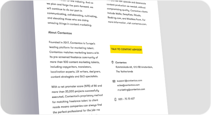 Thank you We’d like to thank all of our marketing Contentoo's managed service model experts for their time, effort, and insights. means an experienced content advisor Without you, this guide would not have works closely with each client. been possible. We can’t wait to see what Companies can upscale and downscale the future holds for the industry. And as content production as needed, without we plan and forge the path forward, we compromising quality. Contentoo clients will continue to do our part in include Mollie, Swapfiets, Rituals, communicating, collaborating, cultivating, Booking.com, and Meatless Farm. For and elevating those who are doing more information, visit contentoo.com. amazing things in content marketing. About Contentoo Founded in 2017, Contentoo is Europe’s leading platform for marketing talent. talk to content advisor Contentoo matches marketing teams with its pre-screened freelance community of more than 500 content marketing talents, Contentoo including copywriters, translators, Koivistokade 68, 1013 BB Amsterdam, localization experts, UX writers, designers, The Netherlands content strategists and SEO specialists. support@contentoo.com With a net promoter score (NPS) of 86 and sales@contentoo.com more than 20,000 projects successfully marketing@contentoo.com executed, Contentoo’s proprietary method for matching freelance talent to client 020 - 70 70 627 needs means companies can always find the perfect professional for the job—no matter the industry, writing style, or content type. Page 17 State of Content Creation 2022