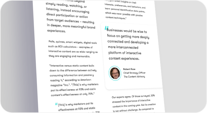 3 who often provide companies with personal information as they engage with it. Content Marketing Institute reiterates Interactive content this point in a recent article: “[With interactive content, organizations Interactive content refers to can] gain direct insights on their content that moves beyond interests, preferences, and behaviors, and learn personal identification data points, simply reading, watching, or which was never possible with passive listening, instead encouraging content techniques.” direct participation or action from target audiences – resulting in deeper, more meaningful brand Businesses would be wise to experiences. focus on getting more deeply connected and developing a Polls, quizzes, smart widgets, digital tools more interconnected such as ROI calculators – examples of interactive content are as wide-ranging as platform of interactive they are engaging and memorable. content experiences. “Interactive versus static content boils Robert Rose down to the difference between actively Chief Strategy Officer consuming information and passively The Content Advisory reading it,” according to American magazine “Inc.”. “[This] is why marketers put its effectiveness at 93% and static content's effectiveness at only 70%.” Our experts agree. Of those surveyed, 30% stressed the importance of interactive [This] is why marketers put its content in the coming year. But its creation effectiveness at 93% and static is not without challenge. As compared to content's effectiveness at only 70%. relatively simple, straightforward content such as blogs or white papers, interactive In addition to efficacy, interactive content requires a larger investment of content holds the potential to collect both money and time. It also requires valuable data from target audiences, specialized talent to create it. Page 5 State of Content Creation 2022