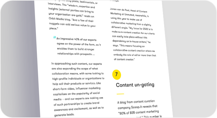 An impressive 40% of our experts agree “That’s something we did this year, and it on the power of the form, as it enables was a very interesting experience. During them to build stronger relationships with the pandemic, many people have created prospects and broadens impact potential, an audience on social media. There are with two organizations leveraging one more influencers than ever before. It’s another’s target audiences to increase another new channel that you can conversions. This can be achieved leverage.” through guest blog posts, testimonials, or interviews. The “wisdom, expertise and Jonas van de Poel, Head of Content insights [external parties can bring to Marketing at Unmuted, meanwhile, is your organization are gold,” reads an using this year to make use of Orbit Media blog. “And a few of their collaborative marketing from a slightly nuggets can add serious value to your different angle. “My focus for 2022 is to piece.” make sure content creation for our clients can easily take place without this An impressive 40% of our experts dependency on in-house writers,” he agree on the power of the form, as it says. “This means focusing on enables them to build stronger collaborative content creation where we relationships with prospects ... embody the role of editor more than that of content creator.” In approaching such content, our experts are also expanding the scope of what collaboration means, with some looking to 7 high-profile individuals or organizations to help sell their products or services. Like Content un-gating short-form video, influencer marketing capitalizes on the popularity of social media – and our experts are making use of such partnerships to create brand A blog from content curation awareness and excitement, as well as to company Scoop.it reveals that generate leads. “80% of B2B content marketing assets are gated.” This number is “If your audience belongs to an industry large, but given gated content’s that has clear thought leaders – people potential for lead generation, is who influence decision-making – then why wouldn’t you want to use them?” asks unsurprising. Sergi Garcia, CMO of Red Points. Page 12 Contentoo Industry Report
