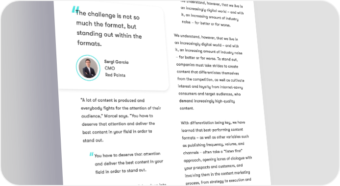 “Channel trends are always overrated. undeniably something to that. But orga- Social media and other publishing nizations should steer away from creating channels will come and go. Content is the content for the sole reason of joining the key, not the channel you use to post it,” party. Whatever its form, your content Regina adds. must simultaneously bring value to your target audience and your organization. Everything else is secondary. We understand, however, that we live in an increasingly digital world – and with it, an increasing amount of industry The challenge is not so noise – for better or for worse. much the format, but We understand, however, that we live in standing out within the an increasingly digital world – and with formats. it, an increasing amount of industry noise – for better or for worse. To stand out, companies must take strides to create Sergi Garcia CMO content that differentiates themselves Red Points from the competition, as well as cultivate interest and loyalty from internet-savvy consumers and target audiences, who “A lot of content is produced and demand increasingly high-quality everybody fights for the attention of their content. audience,” Marcel says. “You have to deserve that attention and deliver the With differentiation being key, we have best content in your field in order to learned that best-performing content stand out. formats – as well as other variables such as publishing frequency, volume, and You have to deserve that attention channels – often take a “listen first” and deliver the best content in your approach, opening lanes of dialogue with field in order to stand out. your prospects and customers, and involving them in the content marketing This can only be done by diving deep into process, from strategy to execution and the target audience and translating measurement. This is the best proxy for insights into creative and valuable deciding what formats are likely to content. The same creativity is needed resonate with your audience, thus making for the distribution of that content.” your content program a success. Page 16 State of Content Creation 2022